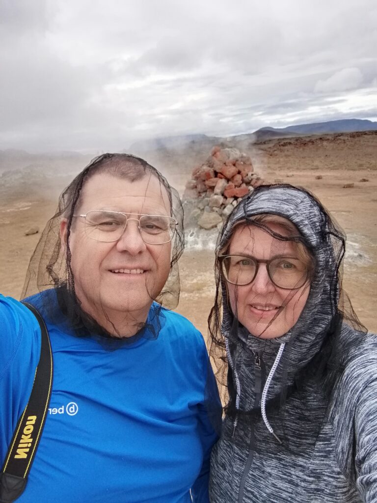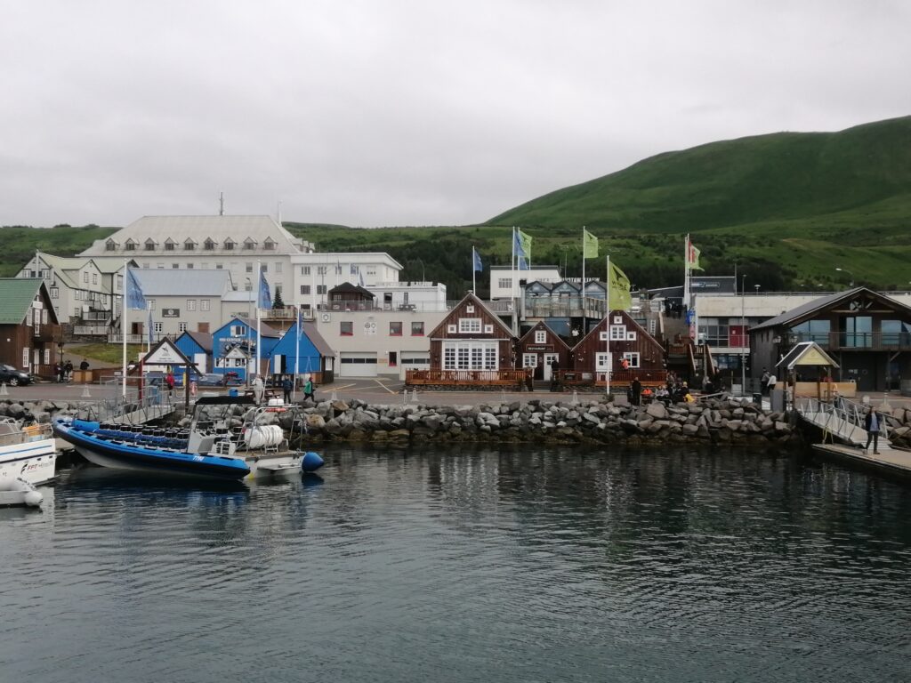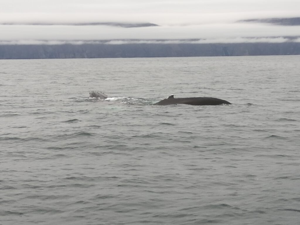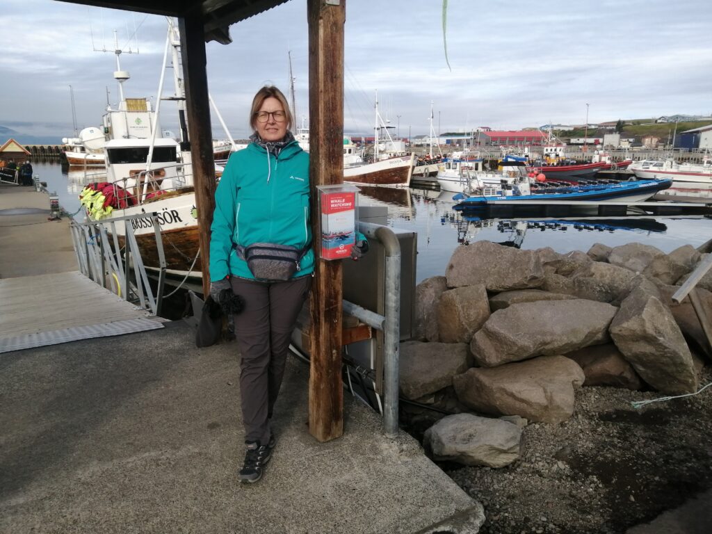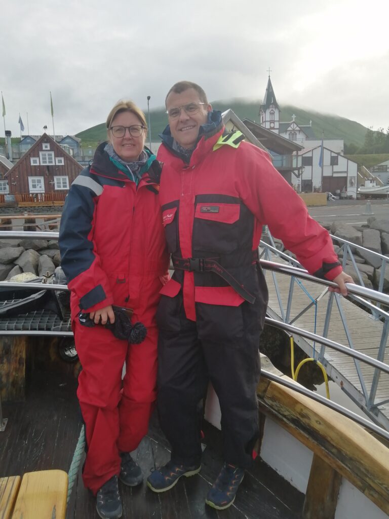 In Húsavík sind wir in einem sehr netten Gistiheimili (mir gefällt das so) untergebracht, dem Guesthouse Arbol. Wie ausgemacht, haben wir pünktlich um 08:00 Uhr das bisher leckerste Frühstück bekommen, sogar am Zimmer serviert. Bereits eine Stunde später ging es mit der Bjössi Sör, einem Eichenboot auf Walbeobachtungsfahrt. Das ursprünglich gebuchte Elektroboot war leider defekt. Das Wetter war perfekt: Windstill, bedeckt und mit angenehmen Temperaturen. Trotzdem warm eingepackt in einen Overall – Ihr kennt ja schon die beiden Teletubbies Dipsy und Po – ging es hinaus in die Skjálfandi Bucht auf die Suche nach Walen, ähnlich der Nadel im Heuhaufen. Einzig die Erfahrung des Kapitäns, Sonarunterstützung und ein Blick auf die anderen Boote können dabei helfen. Delphine und jede Menge Quallen waren vorerst allerdings die einzige Ausbeute. Nach rund 1,5 Stunden bekamen wir dann aber einen Buckelwal zu Gesicht, der friedlich in der Bucht sein Mittagsschläfchen hielt, ab und an unter Wasser verschwand, um prustend und schnaubend an einer anderen Stelle wieder aufzutauchen. Die Passagiere sausten von Steuerbord nach Backbord und wieder zurück, je nachdem, wo er sich gerade befand. Für die Crew sicher ein immer wieder lustig anzusehendes Schauspiel. Auf der Rückfahrt tauchte völlig unerwartet noch ein Minkwal auf, den wir aber mangels Zeit nicht mehr weiter verfolgen konnten. Nach dieser Tour sind wir in Richtung des Mückensees Mývatn gefahren. Und der wird seinem Namen mehr als gerecht: Beim Verlassen des Autos ist man gefühlt von Trilliarden an Zuckmücken umschwärmt, in wahrsten Sinne des Wortes zum Auszucken. Kein Sinnesorgan wird von diesen Biestern ausgelassen. Rasch ab in den nächsten Supermarkt und ein Fliegennetz besorgt, damit ging es einigermaßen. Wir haben dann zu Fuß die Solfataren (das sind Dampfaustrittsstellen von vulkanisch aktiven Gebieten) von Námaskarð im Geothermalgebiet Hverir erkundet. Schwefel und andere Mineralien haben die Landschaft in eine gelb, rot und weiß gefärbte Hexenküche verwandelt, in der es brodelt, dampft und zischt und vor allem gewaltig stinkt. Ein schön anzusehendes aber weniger angenehm zu riechendes Schauspiel. Nach einem kurzen Abstecher zum Viti-Krater im Kraflagebiet und einem kleinen Happen zwischendurch sind wir noch zur mit heißem Wasser gefüllten Grjotagjá-Spalte gefahren. Hier wurde eine Liebesszene aus „Game of Thrones“ zwischen Jon Snow und Ygritte gedreht. Aufgewühlt von dieser Romantik haben wir uns kurzerhand auf den Weg zu den „Myvatn Nature Baths“ gemacht. Ein Onlineticket war schnell gebucht und schon kuschelten wir in diesem lagunenähnlichen Freibad mit milchig blauem, mineralhaltigem Wasser aus natürlichen heißen Quellen. Das war der krönende Abschluss des heutigen Tages und Entspannung pur. Morgen verlassen wir Húsavík und machen uns auf den Weg Richtung Westen. Ein weiterer Wasserfall und zur Abwechslung eine Stadtbesichtigung – geht wirklich in Island, wenn auch nicht oft – stehen auf dem Programm. Allt annað á morgun!