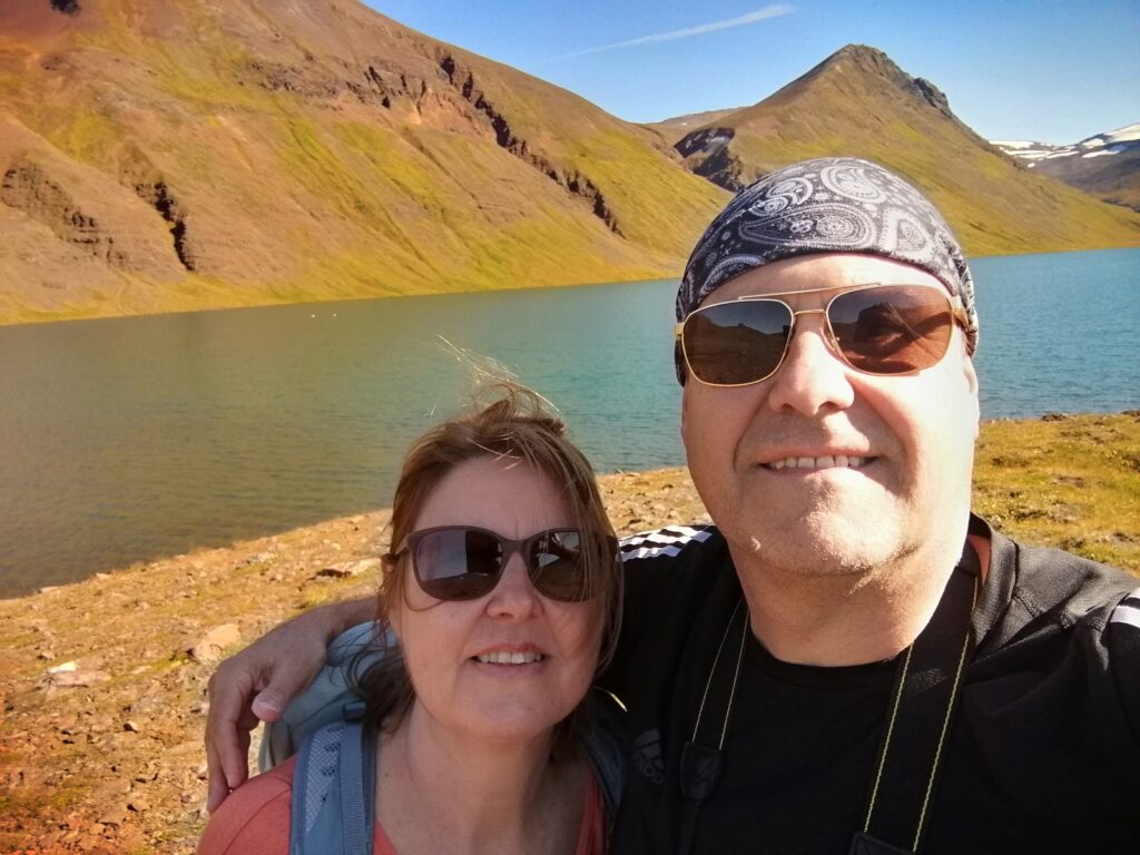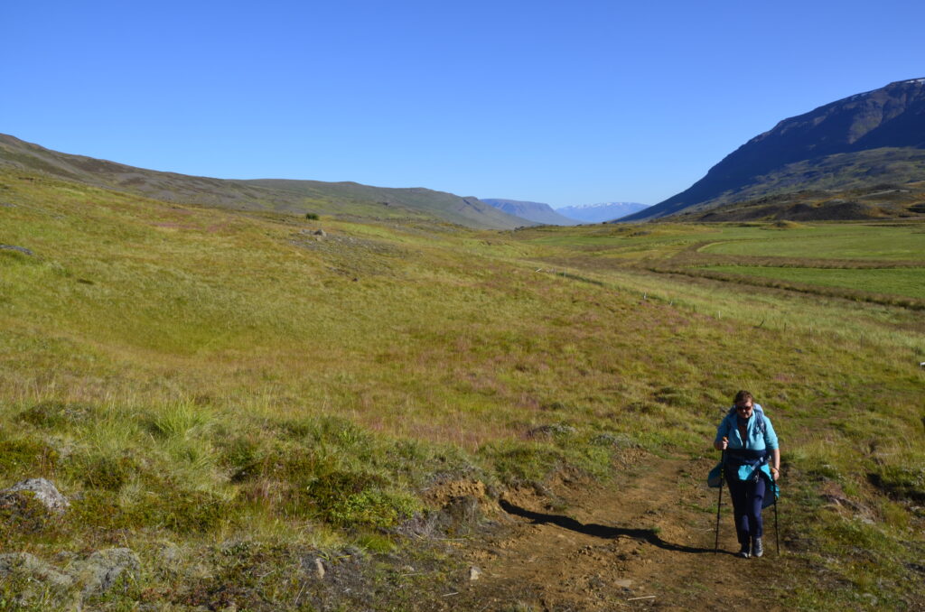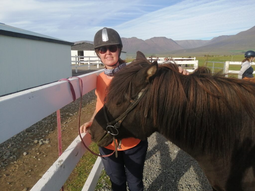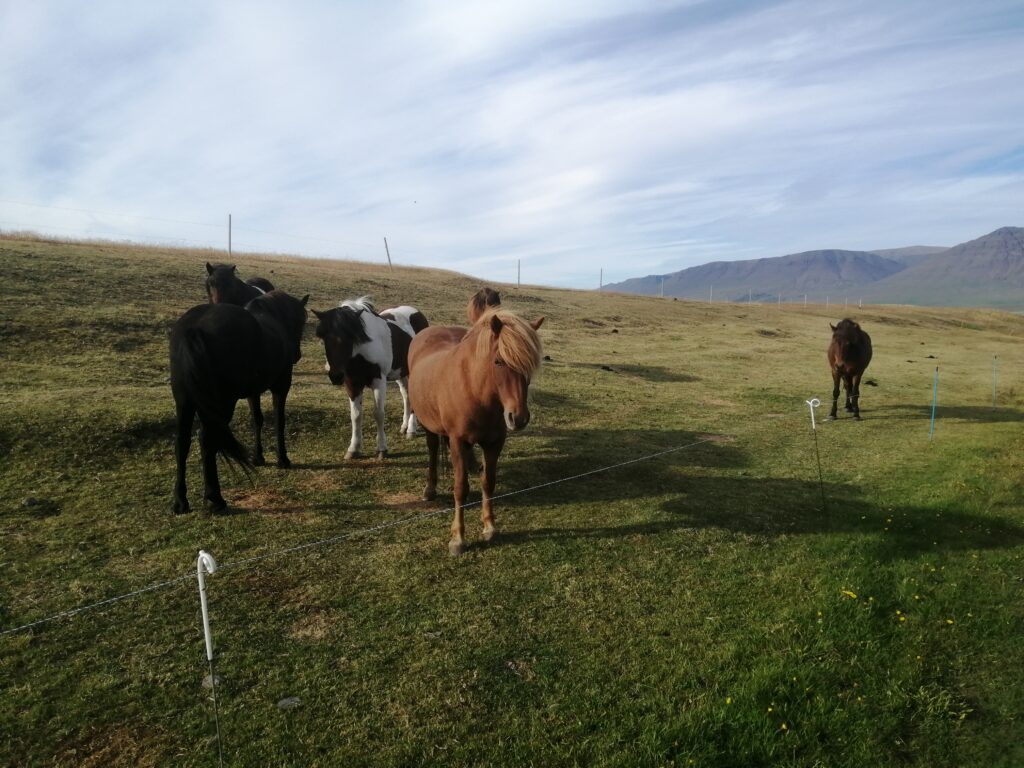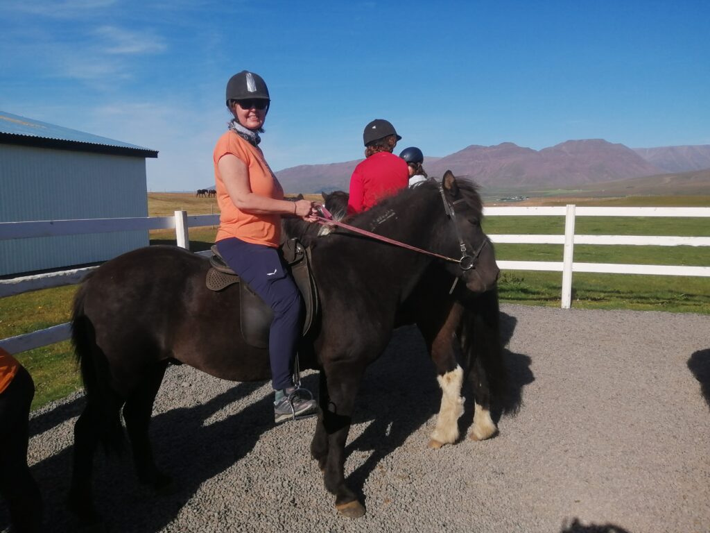 liegt auf dem Rücken der Pferde, so sagt man zumindest. Ein Ausritt mit Islandponys am späteren Nachmittag sollte heute unser Highlight werden. Der Tag startete mit strahlend blauem Himmel und einem wunderbaren Frühstück bei unserer Gastgeberin Elisabeth. Gisi erstand vor der Abfahrt noch ein Paar selbstgestrickte Fußwärmer und ein originelles ebenfalls handgefertigtes wollenes Brillenetui. Damit es die Brillengläser immer kuschelig warm haben, sagt sie! Es standen heute nur wenige Fahrkilometer auf dem Programm und somit hatten wir auch genügend Zeit. Hektik ist in Island ohnehin ein Fremdwort, die Insel hat eine sehr entschleunigende Wirkung. Mit einer Wanderung auf den Bergsee Hraunsvatn im Tal Vatnsdalur haben wir diese Entschleunigung fortgesetzt. Ein gut ausgetretener steiniger Pfad führt steil bergauf, vorbei an saftigem Grün und einem wunderbaren Rundumblick auf die umliegenden Berge und nach rund einer Stunde ist der Bergsee auch schon erreicht. Gut, mit dem Spiegelsee in Schladming kann er vielleicht nicht mithalten, aber er ist trotzdem sehr schön anzusehen und die strahlende Sonne sorgte für die passenden Farben. Wir sind bei Temperaturen um 23 Grad ganz schön ins Schwitzen gekommen. Das sind wir eigentlich nicht gewohnt, nehmen wir aber natürlich dankend an. Nach einer kurzen Rast, bedingt durch lästige Mückenangriffe, ging es wieder bergab und mit unserem Geländewagen weiter Richtung Varmahlíð, zum Treffpunkt unseres Reitausfluges. Fünf unerfahrene Reitanfänger lauschten den Erklärungen unseres Guides Smilla aus Hannover und dann ging es auch schon los. Die Tour dauerte rund 1,5 Stunden, es ging bergauf und bergab, vorbei an einem Canyon mit einem schönen Wasserfall und eine Flussdurchquerung war auch dabei. Das letzte Stück legten wir noch im Tölt zurück, einer ganz eigenen flotten Gangart und man muss aufpassen, nicht aus dem Sattel zu rutschen. John Wayne ist ab jetzt mein zweiter Name! Ein tolles Erlebnis und unsere beiden Ponys Bokki und Sailie sind ohnehin ein Hingucker. Danach ging es zu unserer Unterkunft (wieder einmal „in the Middle of Nowhere“) und mit einem Abendessen in Sauðárkrókur, der größten Siedlung der Großgemeinde Skagafjörður mit rund 2.500 Einwohnern, haben wir den heutigen Tag abgeschlossen. Morgen geht es ab ins Hochland auf die Kjölur-Hochlandpiste F35 zwischen den beiden Gletschern Hofsjökull und Langjökull. Gisi ist schon ganz im Rallyefieber. Leider verheißt die Wettervorhersage nichts Gutes, aber: Bíddu bara og sjáðu til!