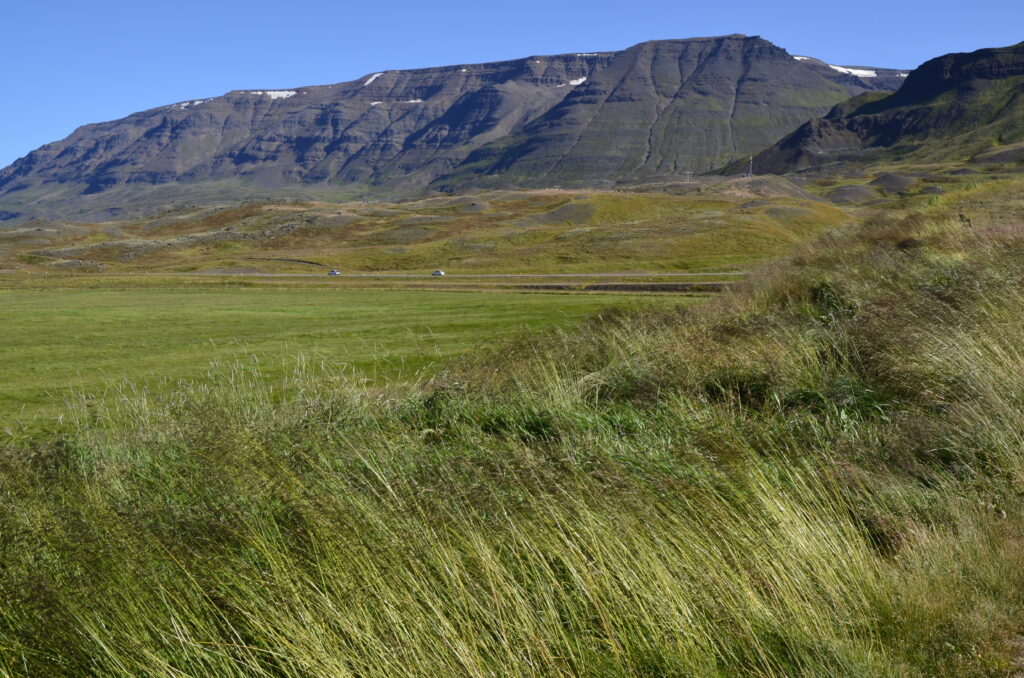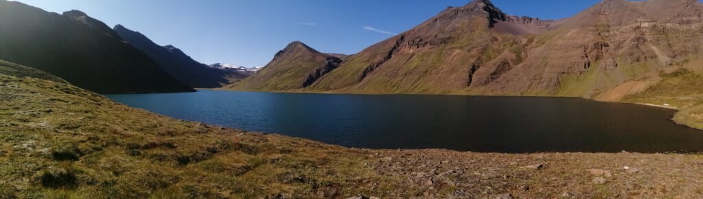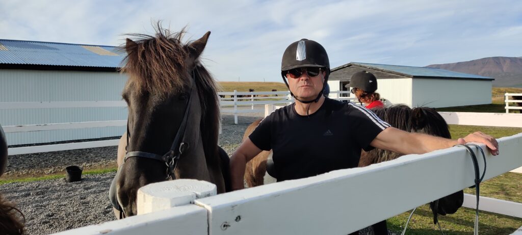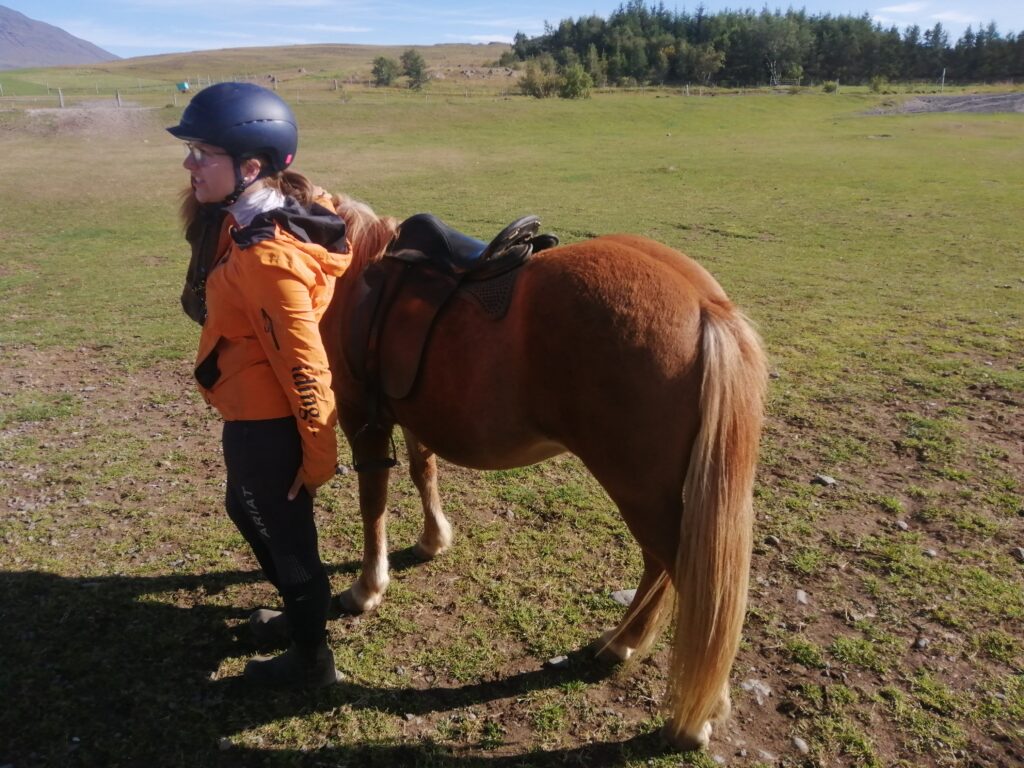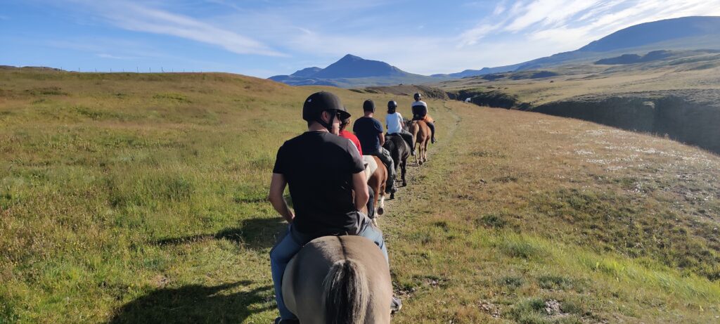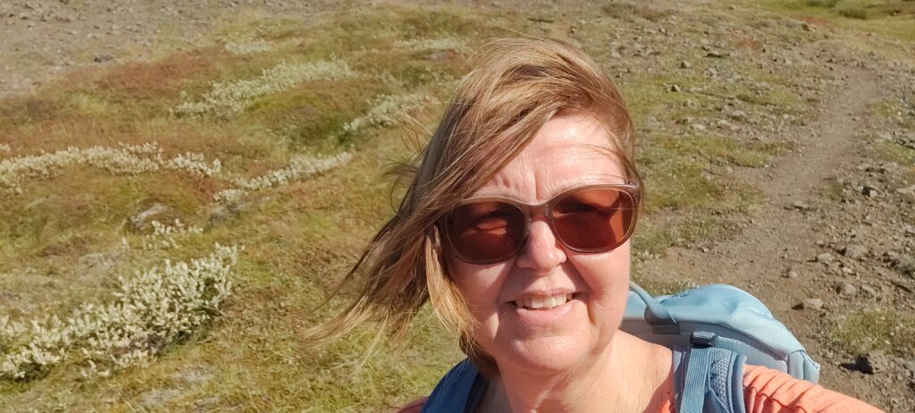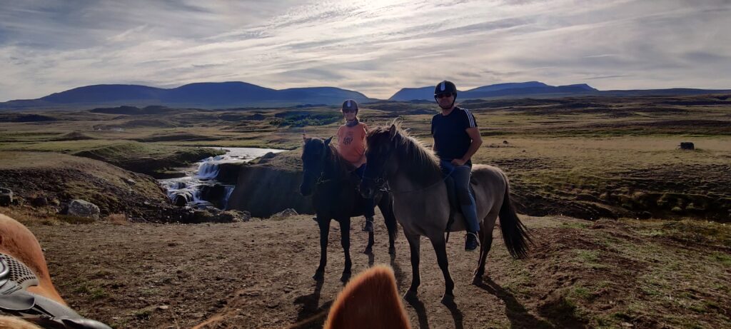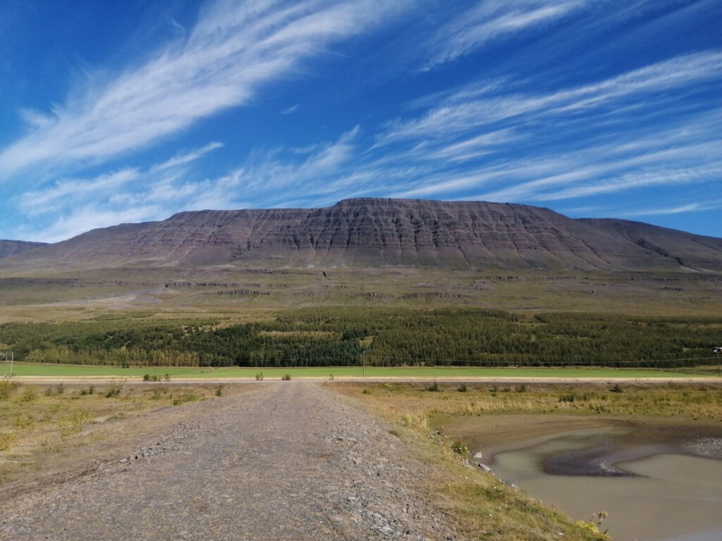 liegt auf dem Rücken der Pferde, so sagt man zumindest. Ein Ausritt mit Islandponys am späteren Nachmittag sollte heute unser Highlight werden. Der Tag startete mit strahlend blauem Himmel und einem wunderbaren Frühstück bei unserer Gastgeberin Elisabeth. Gisi erstand vor der Abfahrt noch ein Paar selbstgestrickte Fußwärmer und ein originelles ebenfalls handgefertigtes wollenes Brillenetui. Damit es die Brillengläser immer kuschelig warm haben, sagt sie! Es standen heute nur wenige Fahrkilometer auf dem Programm und somit hatten wir auch genügend Zeit. Hektik ist in Island ohnehin ein Fremdwort, die Insel hat eine sehr entschleunigende Wirkung. Mit einer Wanderung auf den Bergsee Hraunsvatn im Tal Vatnsdalur haben wir diese Entschleunigung fortgesetzt. Ein gut ausgetretener steiniger Pfad führt steil bergauf, vorbei an saftigem Grün und einem wunderbaren Rundumblick auf die umliegenden Berge und nach rund einer Stunde ist der Bergsee auch schon erreicht. Gut, mit dem Spiegelsee in Schladming kann er vielleicht nicht mithalten, aber er ist trotzdem sehr schön anzusehen und die strahlende Sonne sorgte für die passenden Farben. Wir sind bei Temperaturen um 23 Grad ganz schön ins Schwitzen gekommen. Das sind wir eigentlich nicht gewohnt, nehmen wir aber natürlich dankend an. Nach einer kurzen Rast, bedingt durch lästige Mückenangriffe, ging es wieder bergab und mit unserem Geländewagen weiter Richtung Varmahlíð, zum Treffpunkt unseres Reitausfluges. Fünf unerfahrene Reitanfänger lauschten den Erklärungen unseres Guides Smilla aus Hannover und dann ging es auch schon los. Die Tour dauerte rund 1,5 Stunden, es ging bergauf und bergab, vorbei an einem Canyon mit einem schönen Wasserfall und eine Flussdurchquerung war auch dabei. Das letzte Stück legten wir noch im Tölt zurück, einer ganz eigenen flotten Gangart und man muss aufpassen, nicht aus dem Sattel zu rutschen. John Wayne ist ab jetzt mein zweiter Name! Ein tolles Erlebnis und unsere beiden Ponys Bokki und Sailie sind ohnehin ein Hingucker. Danach ging es zu unserer Unterkunft (wieder einmal „in the Middle of Nowhere“) und mit einem Abendessen in Sauðárkrókur, der größten Siedlung der Großgemeinde Skagafjörður mit rund 2.500 Einwohnern, haben wir den heutigen Tag abgeschlossen. Morgen geht es ab ins Hochland auf die Kjölur-Hochlandpiste F35 zwischen den beiden Gletschern Hofsjökull und Langjökull. Gisi ist schon ganz im Rallyefieber. Leider verheißt die Wettervorhersage nichts Gutes, aber: Bíddu bara og sjáðu til!