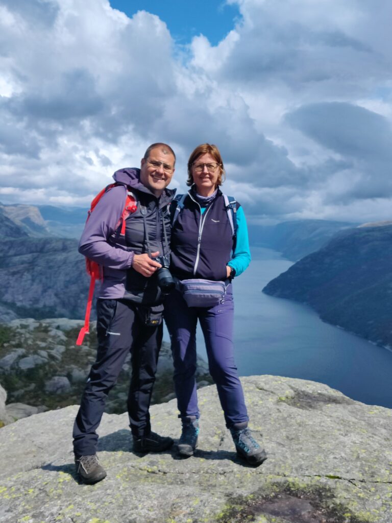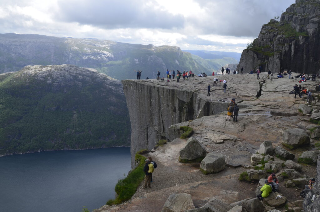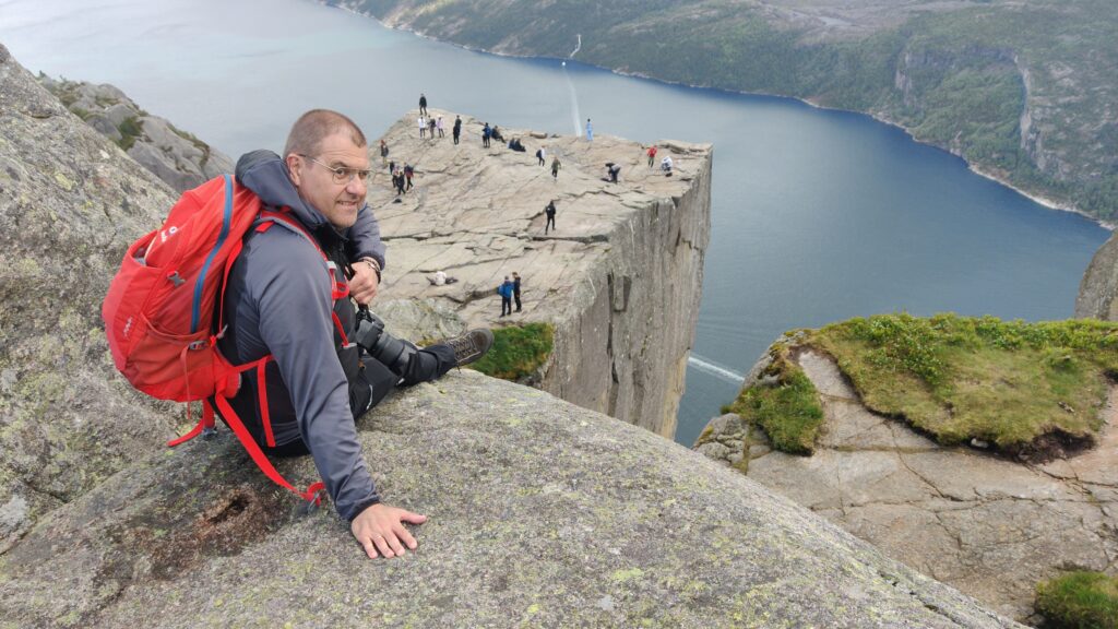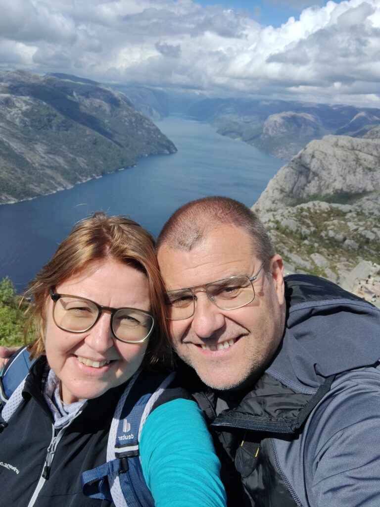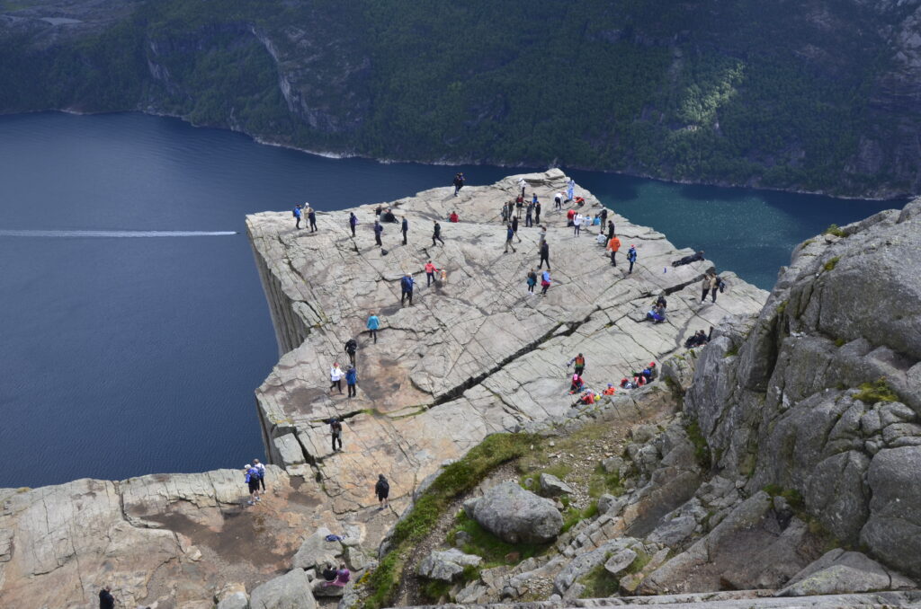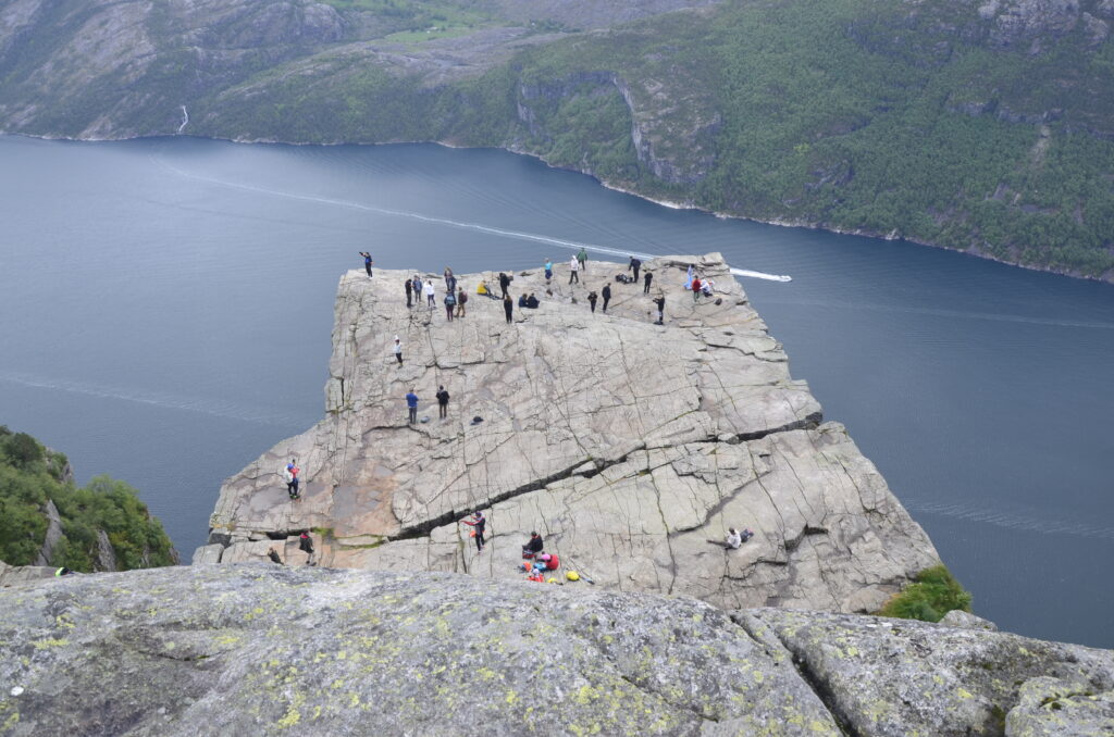 Heute war ein perfekter Tag! Wir wurden vom Regen verschont, die Sonne verwöhnte uns mit ihren warmen Strahlen und ich habe das kritisierte Reisemanagement verbessert: Gisi bekam am Abend eine warme Mahlzeit! Doch von Anfang an. Nach einem guten Frühstück überlegten wir uns, wann denn die beste Zeit für die Wanderung auf den Preikestolen sei. Die Wetterberichte führten uns in die Irre, überall stand etwas anderes. Am Vormittag war der Himmel noch bedeckt und es sah nach Regen aus, spärliche Sonnenfetzen lockerten das Ganze aber auf. Wir beschlossen, noch etwas zuzuwarten und machten einen kleinen Spaziergang in das Zentrum von Jorpeland, einer Kleinstadt mit rund 8.000 Einwohnern und am Idsefjord gelegen. Der weitaus bekanntere und wunderschöne Lysefjord liegt südöstlich der Stadt. Nach einigem Hin und Her machten wir uns dann doch auf den Weg und das war gut so. Wir hätten es nicht besser treffen können. Doch der Reihe nach. Der Preikestolen (was soviel wie Predigtstuhl bedeutet) ist eine natürliche Felsplattform (25 mal 25 Meter) und fällt rund 600 Meter senkrecht in den rund 40 Kilometer langen Lysefjord. Der Weg dorthin ist im wahrsten Sinne des Wortes steinig und hat eine Länge von etwas mehr als vier Kilometer. Dabei sind 500 Höhenmeter zu überwinden. Man ist durchgehend auf mehr oder weniger großen Steinquadern und -stufen unterwegs, die von nepalesischen Sherpas erbaut worden sind. Aufgrund der Regenfälle der letzten Tage herrscht Rutschgefahr und man muss aufpassen, wohin man steigt. Dazu kommen noch die anderen „Trolle“, die auch dieses Ziel vor Augen hatten: Große und Kleine, Dicke und Dünne, Alte und Junge, Hübsche und Perchten, Trainierte und Untrainierte, Vorbereitete und Unvorbereitete! Bei einigen war wir felsenfest davon überzeugt, dass sie gleich nach der ersten Stufe auseinanderbrechen! Die hohe Anzahl von Touristen wird auch von Naturschützern sehr kritisch gesehen. Aber wie dem auch sei, es gibt keinen Eignungstest und die Natur steht jedem offen. Wir haben jedenfalls nicht ganz drei Stunden für den Aufstieg gebraucht. Waren zu dieser Zeit noch Wolken und bedeckter Himmel unsere Begleiter, wurden wir am Ziel mit Sonnenschein empfangen, der bis in die späten Abendstunden anhalten sollte. Und was sollen wir sagen: Der Preikestolen ist atemberaubend, spektakulär, ein Erlebnis! Das hat auch Tom Cruise erkannt und hier Szenen für „Mission Impossible“ gedreht. Es geht wirklich senkrecht hinunter in den Fjord. Ich habe es nicht so mit der Höhe und bin auf Respektabstand zur Felskante gegangen. Einige offensichtliche Lebensmüde haben es sich auf dieser gemütlich gemacht und die Füße munter baumelnd in den Abgrund gestreckt. Man hat einen beeindruckenden Ausblick auf den Fjord und kann von hier oben auch die Fährschiffe erkennen, die mit ihren Schrauben weiße Linien in den Fjord zeichnen. Es bilden sich Menschenschlangen für das beste Fotomotiv: Ganz nahe an der Kante mit dem Lysefjord im Hintergrund. Wir sind dann noch ein ganzes Stück weiter den Berg hochgeklettert und haben abseits der Trollwanderung in Ruhe die warmen Sonnenstrahlen genossen. Aber wenn man oben ist, muss man auch wieder runter. Der rund zweistündige Abstieg hat uns noch einmal extrem gefordert. Die vielen Steinstufen machen einen einfach mit der Zeit kaputt. Wir waren beide am Ende ziemlich geschlaucht, werden diesen Felsen aber mit Sicherheit nicht so schnell vergessen. Morgen geht die Fahrt weiter Richtung Norden. Vi sees i morgen, våre lojale følgesvenner!