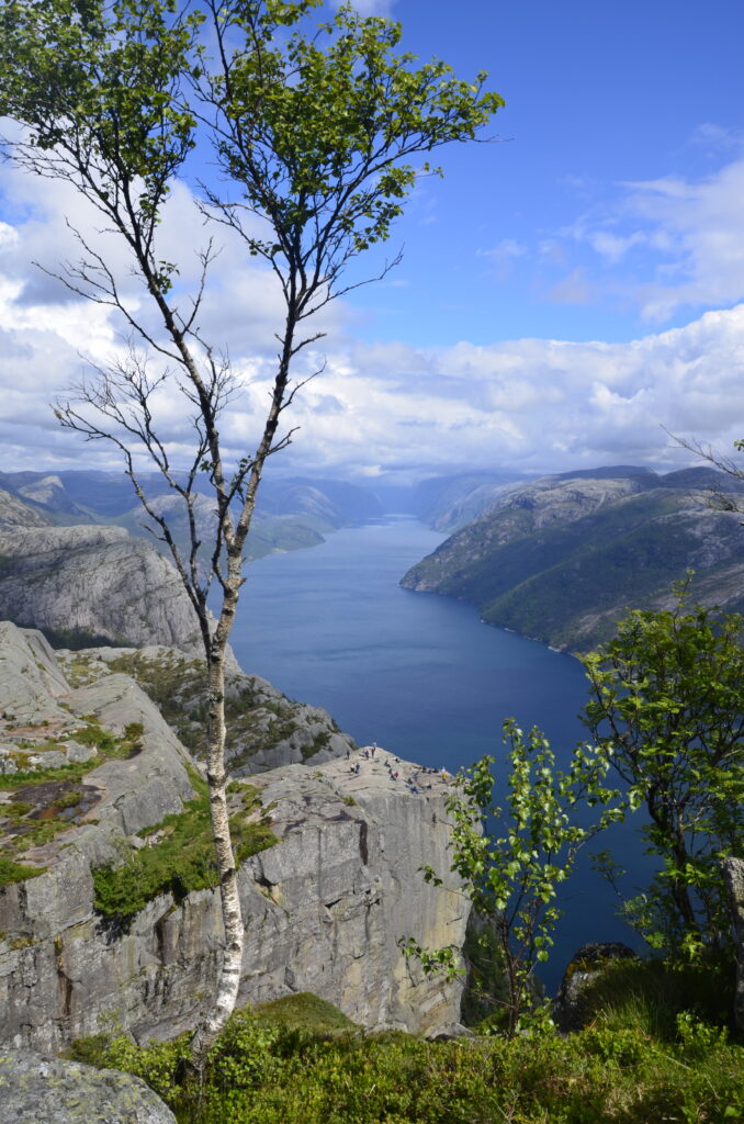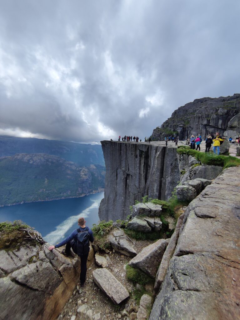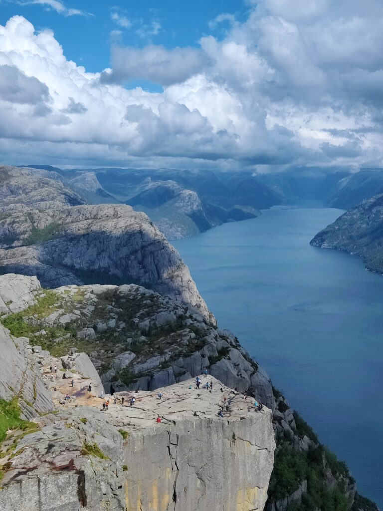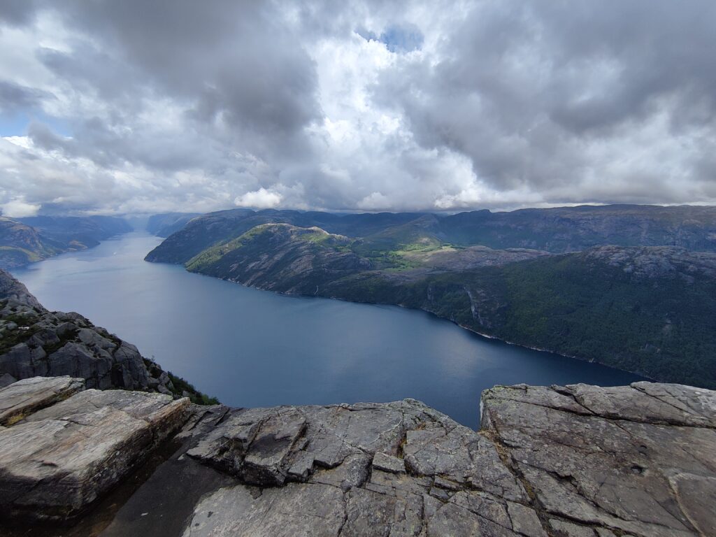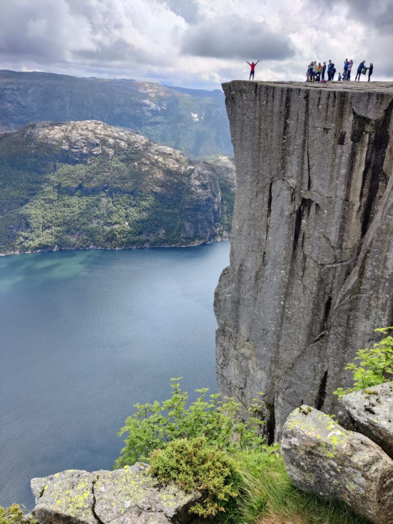Heute war ein perfekter Tag! Wir wurden vom Regen verschont, die Sonne verwöhnte uns mit ihren warmen Strahlen und ich habe das kritisierte Reisemanagement verbessert: Gisi bekam am Abend eine warme Mahlzeit! Doch von Anfang an. Nach einem guten Frühstück überlegten wir uns, wann denn die beste Zeit für die Wanderung auf den Preikestolen sei. Die Wetterberichte führten uns in die Irre, überall stand etwas anderes. Am Vormittag war der Himmel noch bedeckt und es sah nach Regen aus, spärliche Sonnenfetzen lockerten das Ganze aber auf. Wir beschlossen, noch etwas zuzuwarten und machten einen kleinen Spaziergang in das Zentrum von Jorpeland, einer Kleinstadt mit rund 8.000 Einwohnern und am Idsefjord gelegen. Der weitaus bekanntere und wunderschöne Lysefjord liegt südöstlich der Stadt. Nach einigem Hin und Her machten wir uns dann doch auf den Weg und das war gut so. Wir hätten es nicht besser treffen können. Doch der Reihe nach. Der Preikestolen (was soviel wie Predigtstuhl bedeutet) ist eine natürliche Felsplattform (25 mal 25 Meter) und fällt rund 600 Meter senkrecht in den rund 40 Kilometer langen Lysefjord. Der Weg dorthin ist im wahrsten Sinne des Wortes steinig und hat eine Länge von etwas mehr als vier Kilometer. Dabei sind 500 Höhenmeter zu überwinden. Man ist durchgehend auf mehr oder weniger großen Steinquadern und -stufen unterwegs, die von nepalesischen Sherpas erbaut worden sind. Aufgrund der Regenfälle der letzten Tage herrscht Rutschgefahr und man muss aufpassen, wohin man steigt. Dazu kommen noch die anderen „Trolle“, die auch dieses Ziel vor Augen hatten: Große und Kleine, Dicke und Dünne, Alte und Junge, Hübsche und Perchten, Trainierte und Untrainierte, Vorbereitete und Unvorbereitete! Bei einigen war wir felsenfest davon überzeugt, dass sie gleich nach der ersten Stufe auseinanderbrechen! Die hohe Anzahl von Touristen wird auch von Naturschützern sehr kritisch gesehen. Aber wie dem auch sei, es gibt keinen Eignungstest und die Natur steht jedem offen. Wir haben jedenfalls nicht ganz drei Stunden für den Aufstieg gebraucht. Waren zu dieser Zeit noch Wolken und bedeckter Himmel unsere Begleiter, wurden wir am Ziel mit Sonnenschein empfangen, der bis in die späten Abendstunden anhalten sollte. Und was sollen wir sagen: Der Preikestolen ist atemberaubend, spektakulär, ein Erlebnis! Das hat auch Tom Cruise erkannt und hier Szenen für „Mission Impossible“ gedreht. Es geht wirklich senkrecht hinunter in den Fjord. Ich habe es nicht so mit der Höhe und bin auf Respektabstand zur Felskante gegangen. Einige offensichtliche Lebensmüde haben es sich auf dieser gemütlich gemacht und die Füße munter baumelnd in den Abgrund gestreckt. Man hat einen beeindruckenden Ausblick auf den Fjord und kann von hier oben auch die Fährschiffe erkennen, die mit ihren Schrauben weiße Linien in den Fjord zeichnen. Es bilden sich Menschenschlangen für das beste Fotomotiv: Ganz nahe an der Kante mit dem Lysefjord im Hintergrund. Wir sind dann noch ein ganzes Stück weiter den Berg hochgeklettert und haben abseits der Trollwanderung in Ruhe die warmen Sonnenstrahlen genossen. Aber wenn man oben ist, muss man auch wieder runter. Der rund zweistündige Abstieg hat uns noch einmal extrem gefordert. Die vielen Steinstufen machen einen einfach mit der Zeit kaputt. Wir waren beide am Ende ziemlich geschlaucht, werden diesen Felsen aber mit Sicherheit nicht so schnell vergessen. Morgen geht die Fahrt weiter Richtung Norden. Vi sees i morgen, våre lojale følgesvenner!