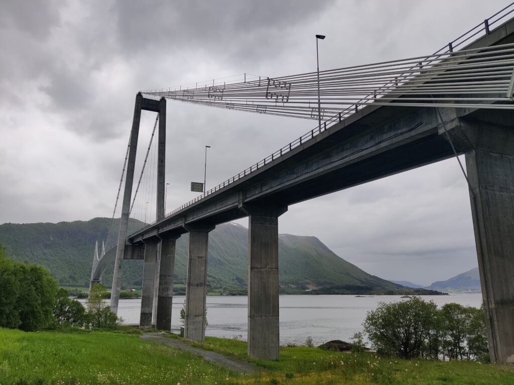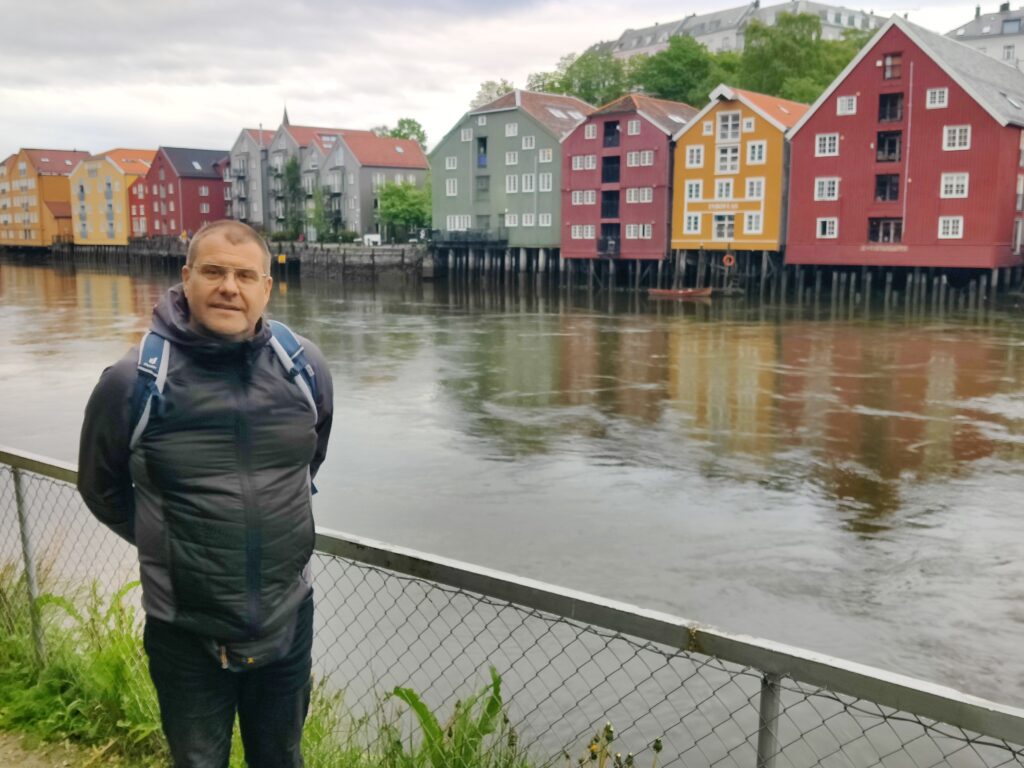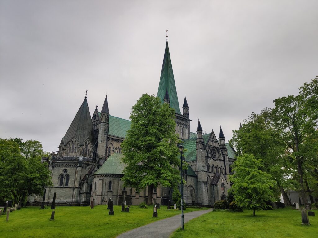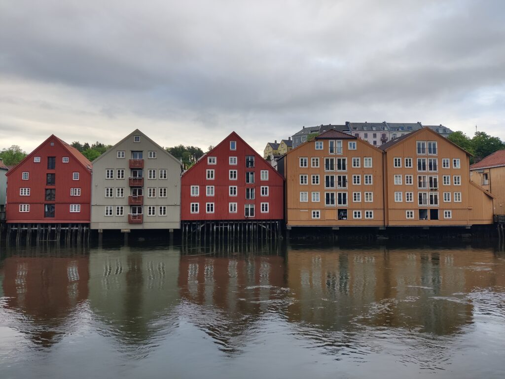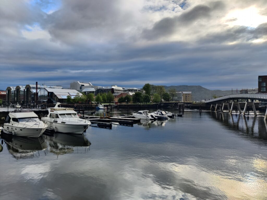 ist in der Stadt Trondheim zu sehen. Und diese Stadt (mit rund 216.000 Einwohnern die drittgrößte Kommune Norwegens), am Fluß Nidelva gelegen, war unser heutiges Tagesziel. Wir haben unser Hotel in Alesund bei bedecktem Himmel verlassen und machten uns auf die Reise. Rund 300 Kilometer galt es zu bewältigen. Das klingt nicht viel, aber die Fahrzeit beträgt rund 5,5 Stunden. Die Fahrt war unspektakulär und die Landschaft veränderte sich währenddessen, wurde zusehends flacher und erinnerte uns an zu Hause. Wir überqueren mit Fähren manch schöne Schären (Entschuldigung für das Wortspiel) und haben in einem unscheinbaren Restaurant eines Campingplatzes ein sehr schmackhaftes Essen eingenommen. Gecampt wird in Norwegen ohnehin an allen nur erdenklichen Plätzen und diese sind auch gut besucht. Das Wetter konnte sich nicht entscheiden, kaum Sonne und immer wieder Regenschauer. Aber das saure Häppchen kam erst. In Trondheim angekommen haben wir unser Quartier bezogen, hinter dem Dom gelegen und im Stil eines ehemaligen Kriegslazarettes. „So eine Tschumsen!“ waren die ersten Worte meines Schatzes. Ich fand es nicht so schlimm, bin aber in diesen Dingen kein wirklicher Maßstab. Na gut, die Aufputzkabel und -leitungen sind vielleicht wirklich nicht mehr State of the Art und die Einrichtung erinnerte an einen Flohmarkt. Aber im Badezimmer gab es einen modernen Abzieher, um die Überschwemmung nach dem Duschen so gering wie möglich zu halten. Wir machten trotz dunkelster Regenwolken noch einen kleinen Stadtrundgang und wie auf Kommando begann es auch aus Kübeln zu schütten. Den Menschen hier ist das aber egal. Es wird gejoggt, Rad gefahren und im strömenden Regen geplaudert. Dicke Kleidung? Fehlanzeige! Wir verdrückten uns in ein nettes Lokal und warteten das Gewitter ab. Nachdem der Regen nachgelassen hatte, setzten wir unseren Rundgang fort. Die Stadt hat allerdings keinen Charme und hat uns nicht gefallen. Morgen steht uns noch einmal eine längere Fahrt bevor. Es geht weiter Richtung Norden nach Mo i Rana, wahrscheinlich über den Kystriksveien, einer spektakulären Küstenstraße an der Atlantikküste. Men la oss se i morgen!